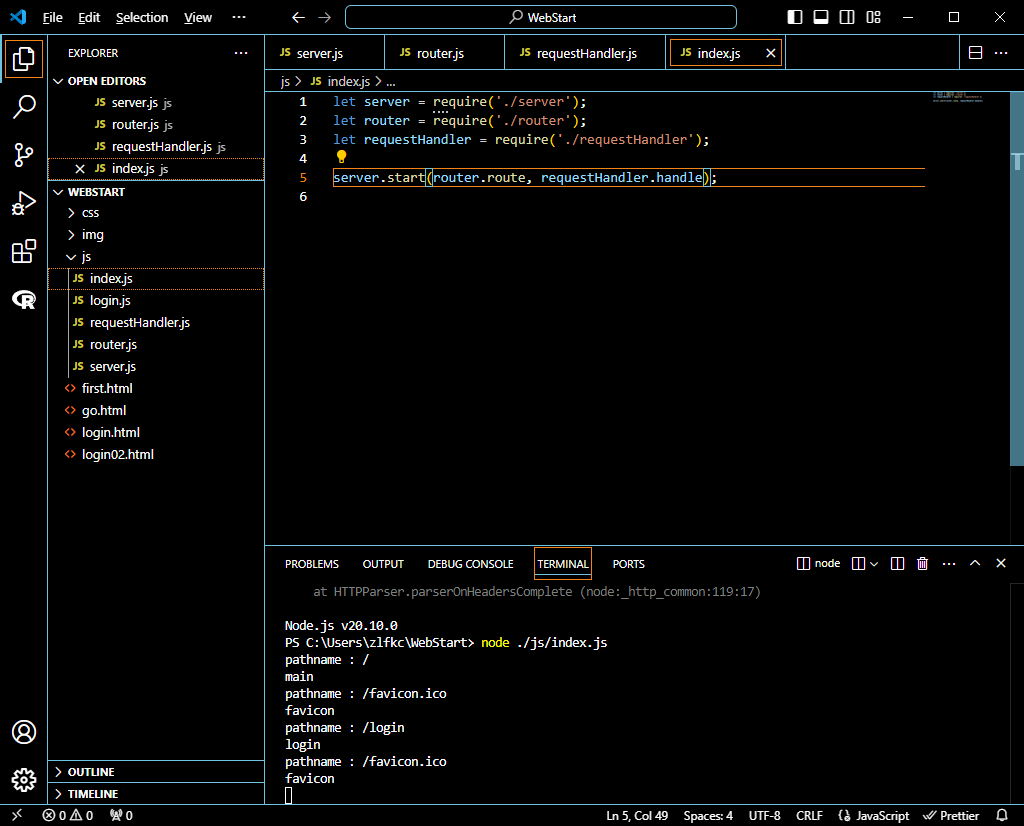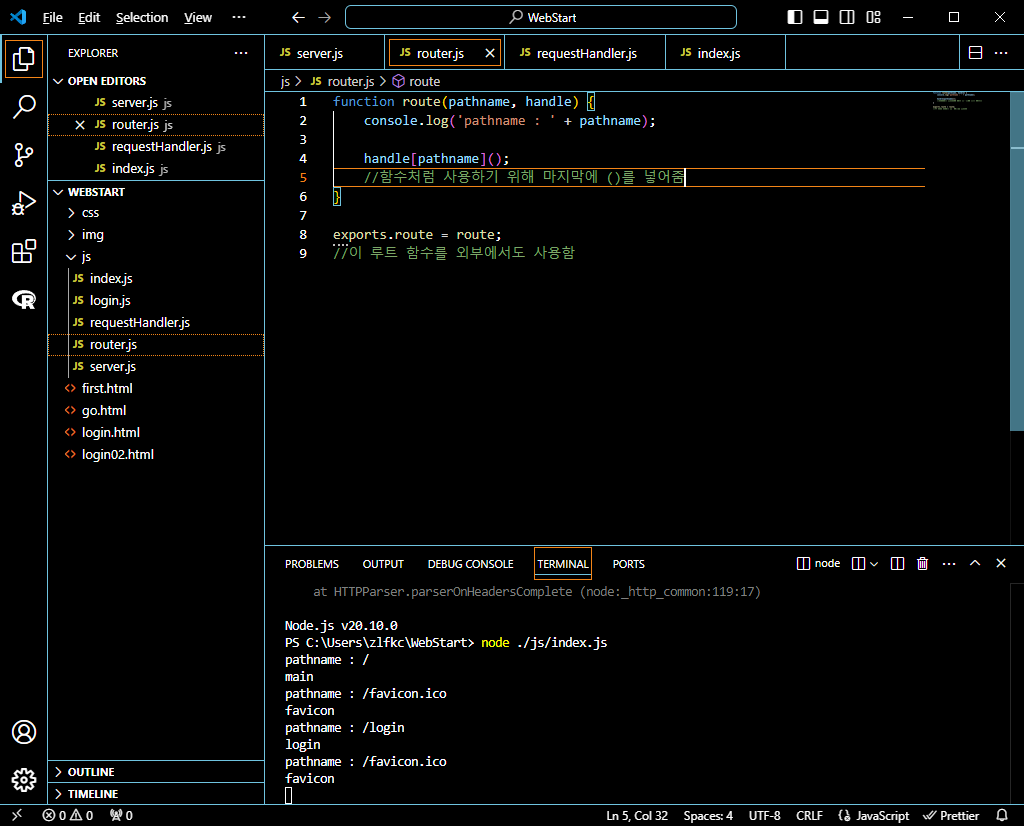 여기서 작동 순서는 index -> (router 사용해라) -> server -> router가 됨